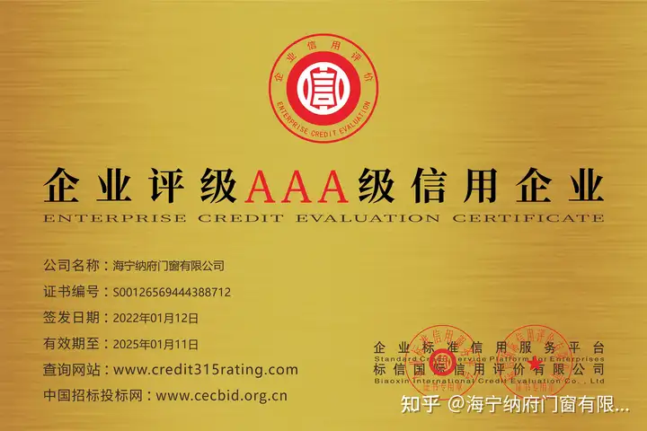 此次海宁纳府门窗有限公司,获得AAA级认证是公司上上下下齐心协力的结果,也是纳府门窗的初心,同时也是公司新的起点,纳府门窗一定会借此契机,创造更大的辉煌。